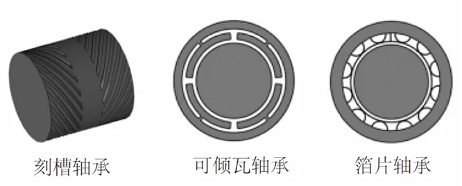 两相对运动表面形成一定收敛间隙,运动表面的高速移动将具有黏滞性的气体带入楔形间隙产生压力升,进而产生作用于转子的承载力,承载力的大小随转速的增加而增加。楔形间隙、润滑气膜厚度及气体的黏滞性是形成动压效应的关键条件。由于摆脱了对气源供气系统的依赖,使得气体动压轴承结构简单、成本降低。但是,在启停阶段转速较低、动压效应较弱时,不足以产生作用于转子的支撑力,导致转子与轴承内壁接触,产生严重的摩擦磨损,直接影响轴承的寿命。此外,气体动压轴承还存在阻尼特性差,转子过临界难的问题。针对以上问题,研究者通过开发耐磨涂层或设计不同结构形式的轴承来解决此问题。其中比较有代表性的气体动压轴承结构形式有刻槽气体动压轴承、可倾瓦气体动压轴承、箔片气体动压轴承,如图4所示。