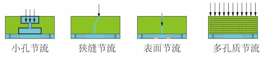 为了确保气体静压轴承获得较好的特性,要求承载间隙较小,通常间隙值为5~20 μm,当承载间隙改变时,轴承的气膜压力分布与承载力也会随之改变。考虑到微尘颗粒尺寸与承载间隙尺寸相近,气体源要经过严格过滤才能进入轴承间隙。气体静压轴承设计中节流器设计是其重要的设计部分,直接影响轴承的性能。根据气体静压轴承的节流形式(如图2)可将其分为小孔节流气体静压轴承、表面节流气体静压轴承、狭缝节流气体静压轴承和多孔质节流气体静压轴承等。