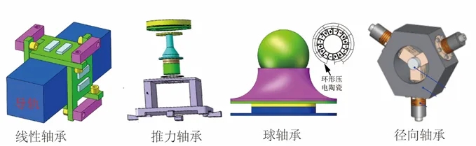 当前,对于挤压膜气体轴承的研究主要集中在润滑机理分析和轴承结构改进上。对于润滑机理的研究主要从两种理论进行分析,分别是声辐射理论和流体润滑理论。由于流体润滑理论便于分析转速对挤压膜气体轴承特性的影响,因此,被大多数研究者采用。对于挤压膜气体轴承结构的改进上,研究者分别提出了挤压膜气体线性轴承、挤压膜气体推力轴承、挤压膜气体球轴承、挤压膜气体径向轴承,如图6所示。