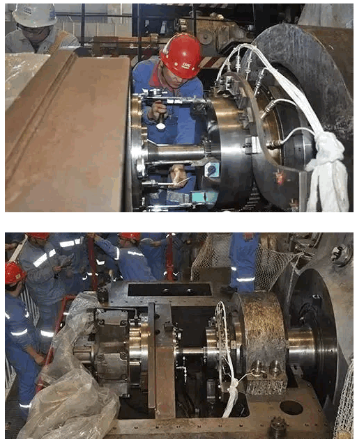 2.如离合器损坏,同时盘车小轴瓦有较严重的磨损,需更换备件,并联系厂家修复。盘车装置修后安装时,需要对盘车重新找中,必要时应在盘车装置和轴承座结合法兰面加垫片,以修正盘车与高压转子中心。找中完成后须重新钻配盘车装置与1号轴承座之间的定位销。